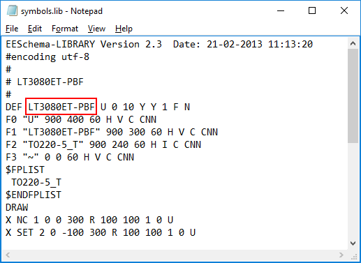 Open symbols.lib with text editor and copy a name of the parts which you can find in first parameter of DEF line. In this particular example case, it’s “LT3080ET-PBF”. Additionally you can change the third parameter which will be shown in schematics as U1, R2, IC3, C4 and so on.